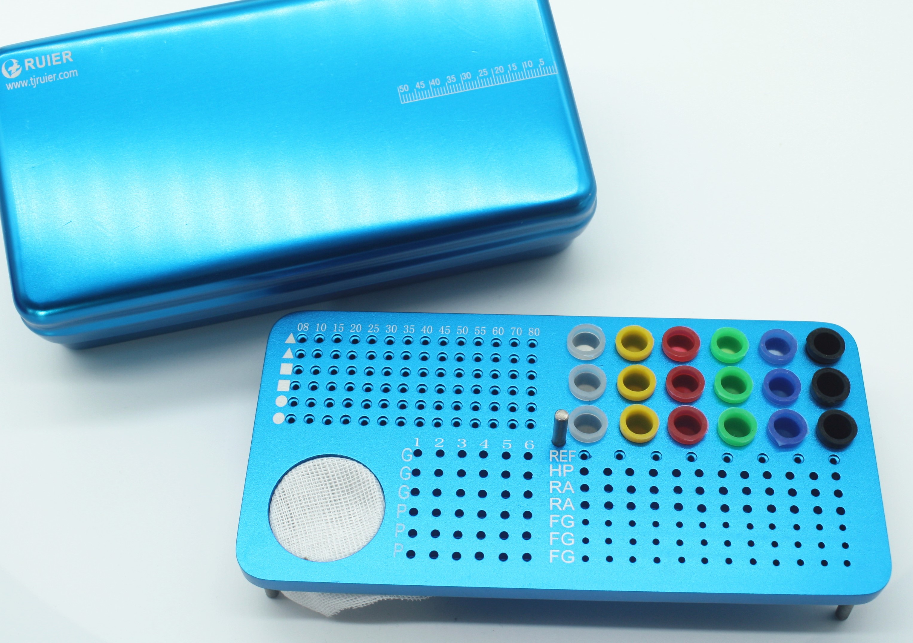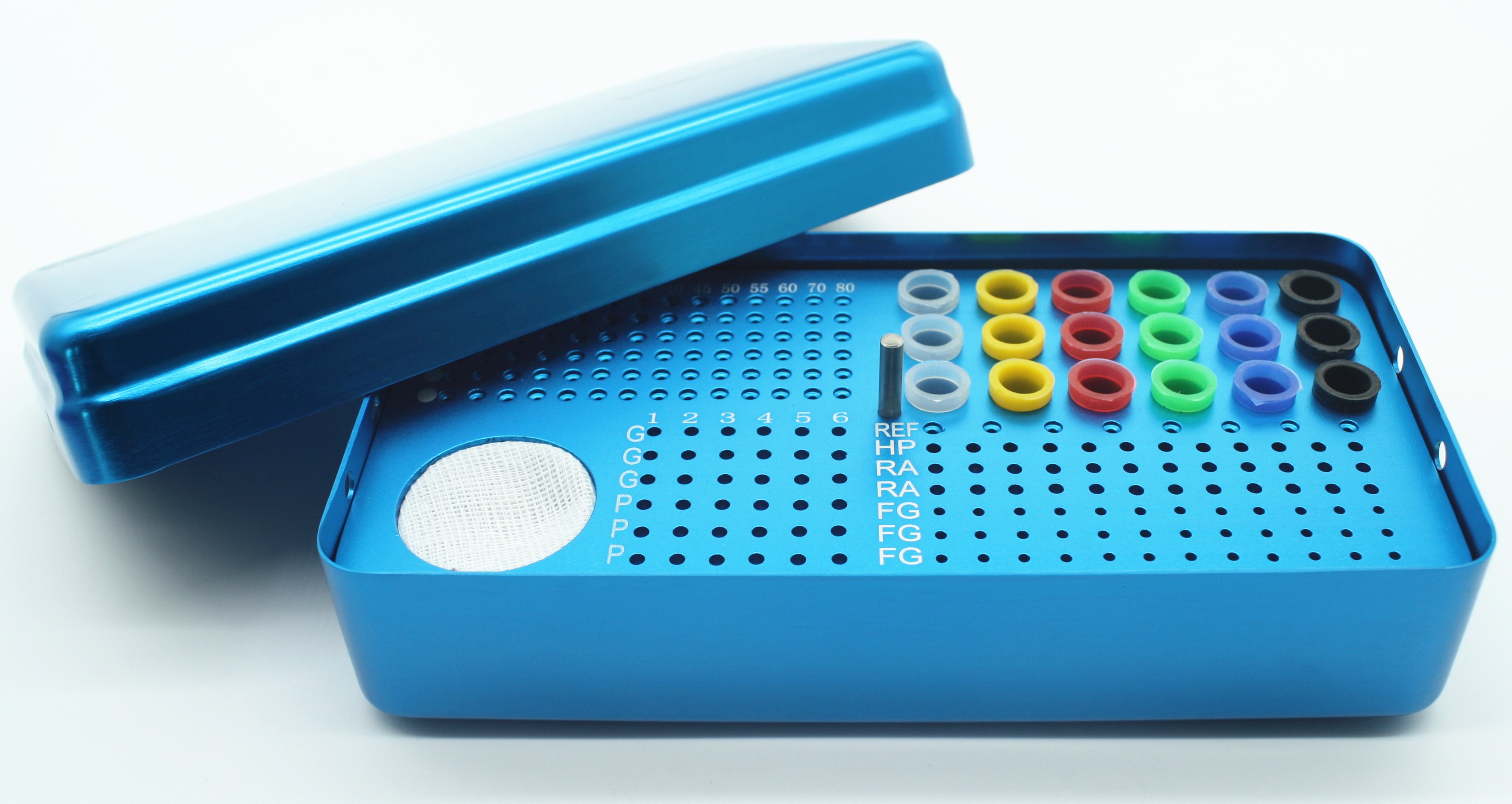 性能:适用于放置消毒扩大针、锉,G钻、P钻,大锥度锉,慢长车针,慢短车针,高速车针,牙胶尖等